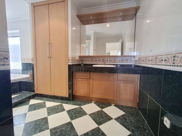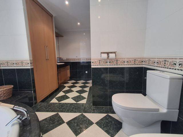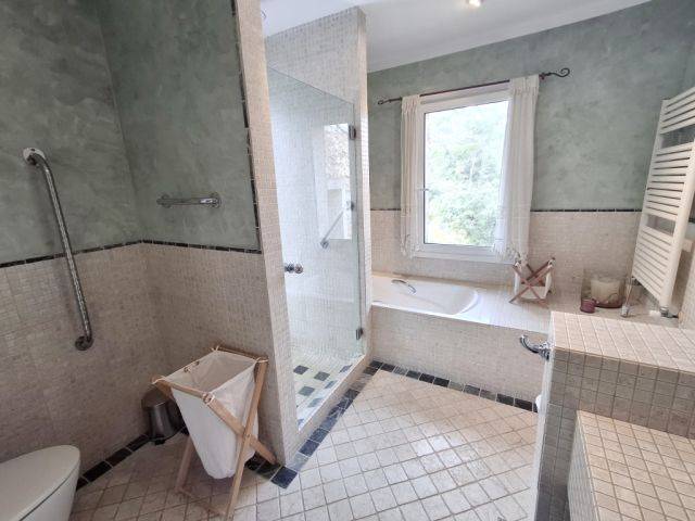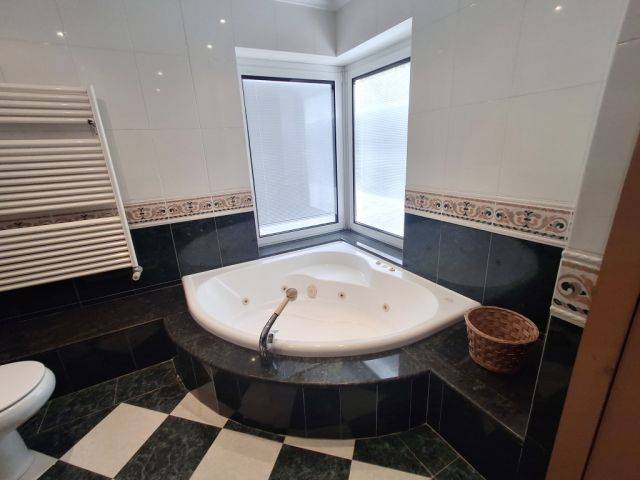 The 1st floor has approx. 160 m2 living space with a large and bright living room with a closed fireplace and balcony + terrace access. A few steps up are the 3 bedrooms with fitted wardrobes and 2 bathrooms (one en‑suite with shower and bathtub and one with shower and jacuzzi).