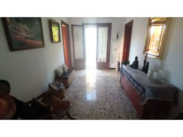 Entrance area with a bedroom branching off to the left, to the right the living room with an adjacent small bathroom with bathtub - straight ahead - separated by a glass door - the dining room with terrace exit and adjoining 2nd bedroom and a somewhat outdated kitchen with a large fireplace, electric household appliances (gas hob), which also has a terrace exit.