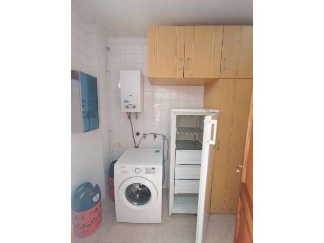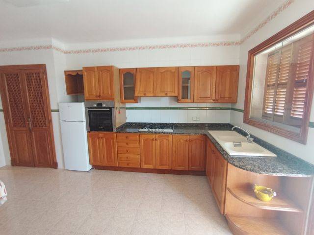 The entrance is the living-dining room with open fireplace and behind it follows 1 bathroom with shower, 3 double bedrooms with fitted wardrobes, 1 bathroom with bathtub / shower and a large furnished wooden fitted kitchen which is equipped with gas cooking stoves, electric oven, refrigerator and next door - a laundry room with washing machine, gas boiler and another refrigerator.