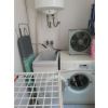 The inviting entrance area is the living-dining room with an open brown modern fitted kitchen and a counter. It is equipped with ceramic hob, refrigerator, electric stove, microwave, toaster. Behind it is a laundry room with a large window front and an electric hot water heater of 75 l.