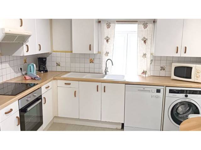 We have the main entrance – to the left of which are 2 double bedrooms with 1 bathroom ensuite (with bathtub – shower) and to the right of the entrance – via 3 steps – leads to the living room with access to the terrace. From here you can access the separate dining room and the large and practical furnished fitted kitchen which is equipped with ceramic hobs, electric oven, fridge, dishwasher, microwave and washing machine.