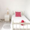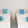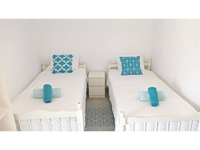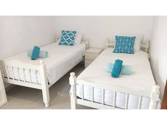 To the left of the kitchen (with access to the terrace) there are 2 more bedrooms with single beds and to the right of the kitchen is 1 bathroom with shower and double sink.