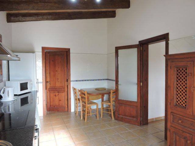 The cozy fitted kitchen is kept in Mallorcan style - with built masonry base units with curtains, beautiful rustic dish cabinets and a pantry combined with modern appliances (incl. dishwasher).
