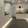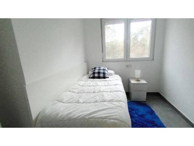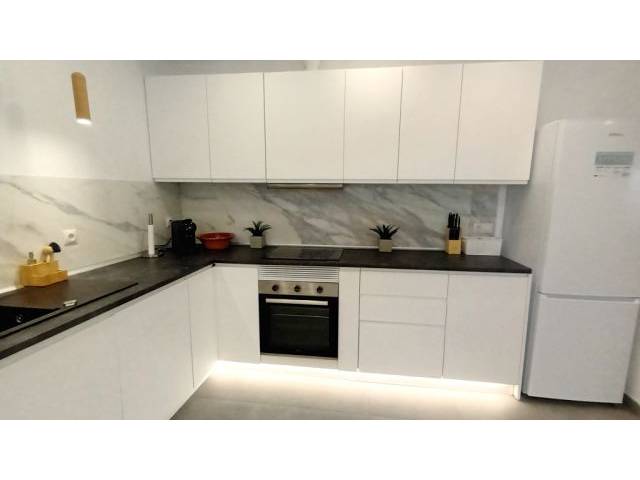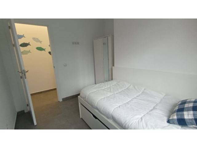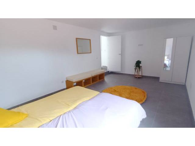 The entrance area is a hallway from which the large bright living-dining room is located on the left (connected by a 2-leaf sliding door) and on the right is an integrated white modern fitted kitchen (with all electrical appliances incl. dishwasher). Behind it is a storage room for provisions and via a small corridor you continue to 1 bathroom with shower and a large bedroom. The hallway also has an exit to the garden.