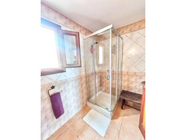 Sweet house near Cala Romántica for long term rent. With a great eye for detail, the landlords have decorated and equipped their small domicile here. The house belongs to a quiet residential complex with a communal pool. On the ground floor level there is a guest toilet with washing machine and hot water boiler, the American kitchen, which is connected to the adjoining dining area via the counter. This is also where the air conditioning is located. From the cozy living room you can access the spacious covered terrace, as well as a small private garden area, which each of the houses has. Via your own garden you can also reach the pool of the complex in a few steps. On the upper floor of the house there is a beautiful bedroom, with its own bathroom en suite, as well as another bedroom and another, separate bathroom. Both bathrooms with showers.