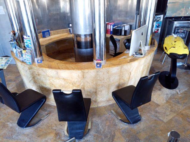 The office is an eye-catcher with large illuminated display cases, plenty of window space, and 2 large entrances. The reception area features a large marble counter and a built-in stainless steel staircase.