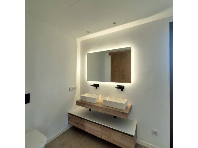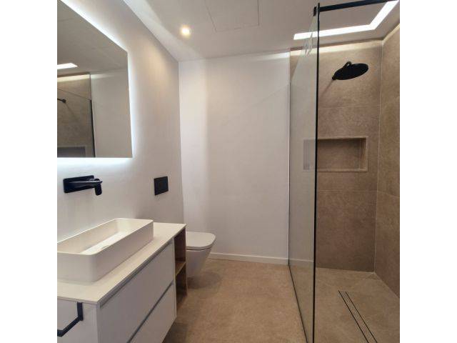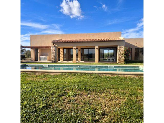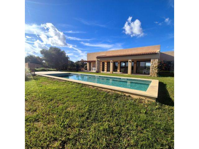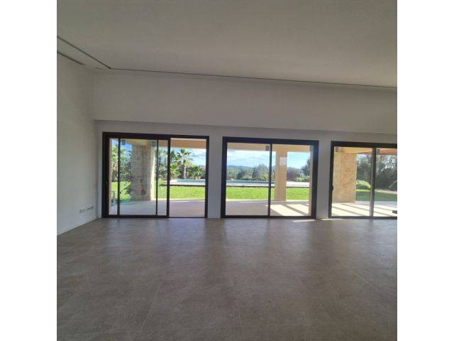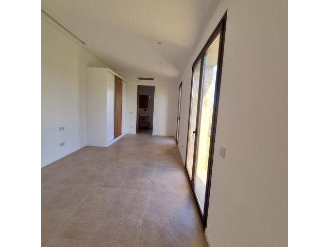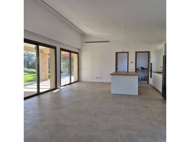 The daytime area centers around a large living-dining room with an open, modern and functional kitchen, designed for enjoying family and social life. From here you can access the porch directly, a perfect spot to enjoy afternoons outdoors, surrounded by lawn and Mediterranean vegetation. The pool and solarium complete this ideal outdoor setting for unwinding and enjoying the Mallorcan climate.
