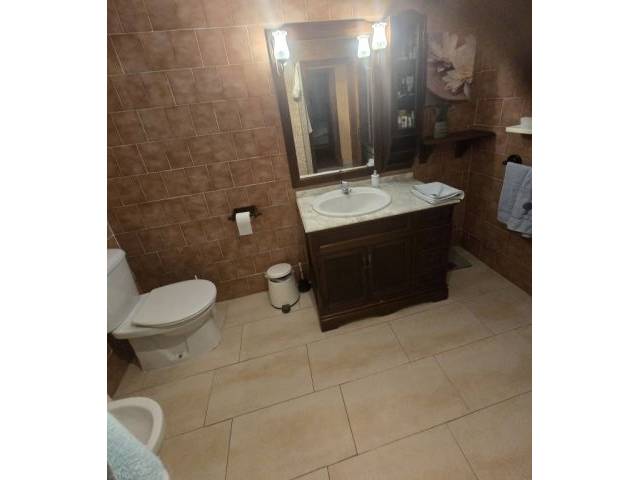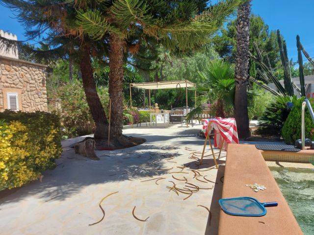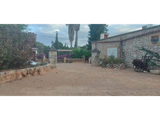 Finca Mallorca on over 4000 sqm of fenced land in Inca. The large garden with palm trees, Ayurveda, olive/ lemon/ orange/ persimmon/ nut and apricot trees offers plenty of idyll and invites you to relax. The pool has been newly tiled and received new equipment (salt filtration system, underwater spotlights). The wellness experience is completed by a whirlpool for six people and a solar shower. The property is accessed via an electric gate; the long driveway is lined with lighting on a timer. There are several terraces, partly covered, with various seating options and floodlights. The finca is very central yet rural; you can reach Inca and the motorway in a few minutes. 20 minutes to/from the airport. The house, all on one level, has three bedrooms, two bathrooms (one en suite, which was just renovated. Both bathrooms have stepless shower access), a kitchen with pantry, two living rooms and a well room with panoramic views. The bedrooms have large built-in wardrobes. The house is air-conditioned and has two fireplaces with inserts. The interior and exterior have been freshly painted, partly with high-quality specialist paint. Separate guest house with bathroom/WC/shower and a glass front to the pool side that can be fully opened, gas grill with sink.