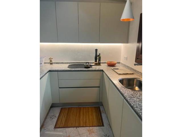 Equipped kitchen. The open spiral staircase leads to the upper floor with a large bedroom