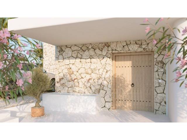 On the first floor, you will find three double bedrooms, each designed to make the most of natural light and space. The master bedroom, with its en-suite bathroom, is a private retreat where you can relax and disconnect from the daily hustle and bustle. The other two bedrooms share a spacious bathroom. All rooms have access to a magnificent covered terrace, where a beautiful wooden pergola with beams in the Ibizan style adds a warm and exclusive touch. This space is ideal for enjoying incredible sunsets and panoramic views.