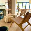 Bright living room with fireplace and a terrace on the upper floor (with view of the pool)