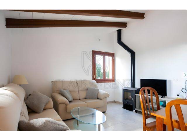 The single-storey building has 112 m² of living space and an additional 60 m² outbuilding next door, which can be used, for example, as a garage. Upon entering the house you arrive in a spacious living-dining room with an open kitchen and a fireplace. The traditional tiles in the kitchen and the wooden beams in the living room give it a special touch. Three bedrooms share one bathroom, while the spacious master bedroom has its own bathroom and a separate dressing room. The bedrooms are equipped with warm/cold air conditioning.