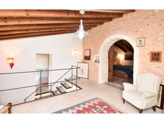 Features: The house has modern cement floors with many inlays such as river pebbles, horseshoes or stones. Partly exposed stone walls and round arches revive the very special charm of this old finca.