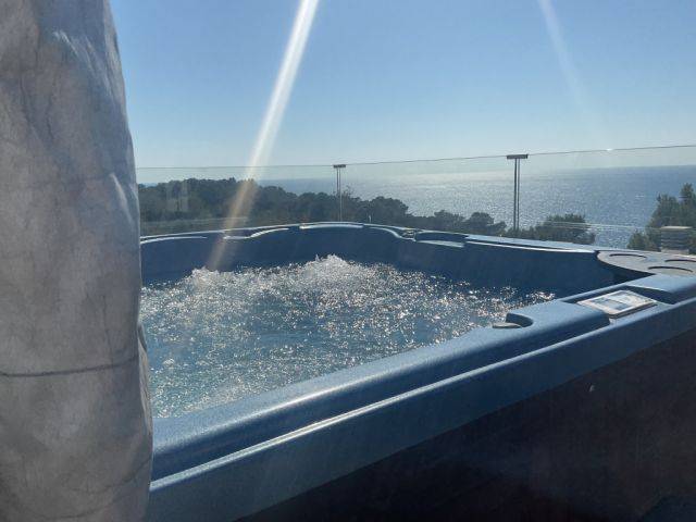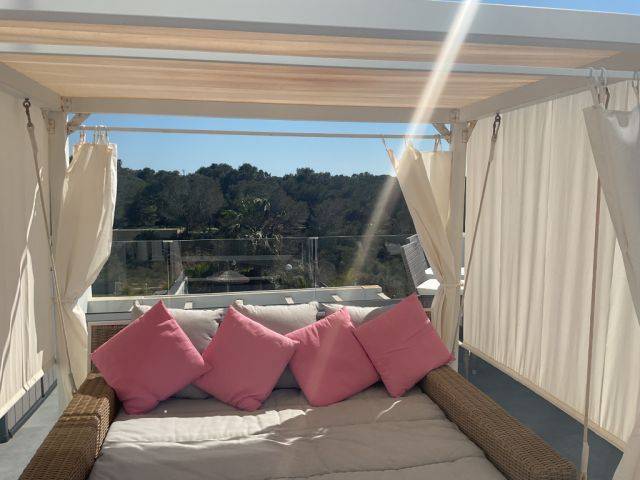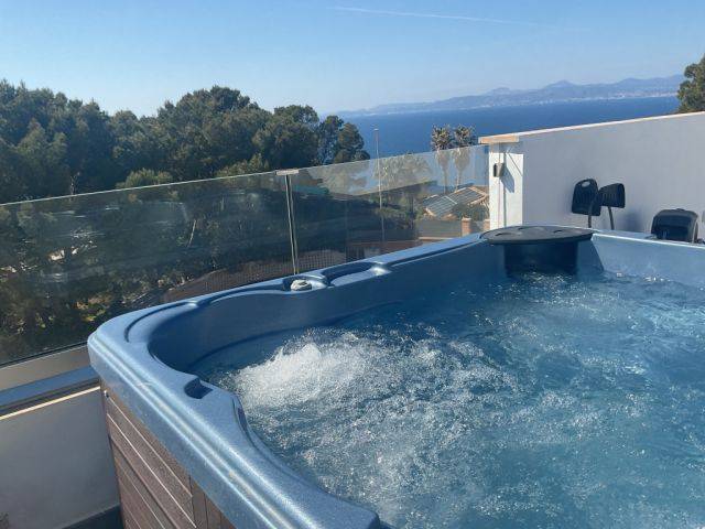 The entire upper area of the house is designed as a generous master suite, which has an exclusive bathroom and two private terraces. Another highlight of the house is the luxurious roof terrace of about 25 m², which is equipped with a heated whirlpool for 5 people and offers a breathtaking view as far as Palma.