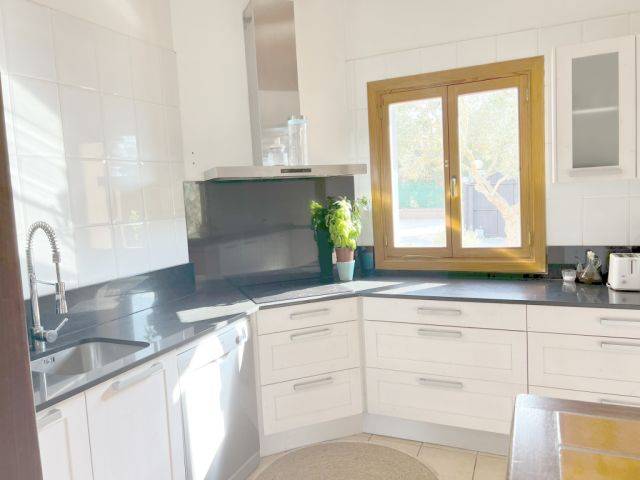 Large, fully equipped kitchen with double refrigerator, dishwasher, oven, microwave and induction hob.
