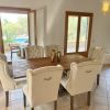 Covered terrace with dining table for 10 people and a cozy seating area overlooking the garden and pool.