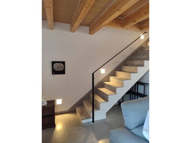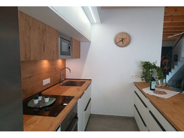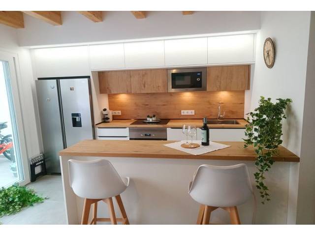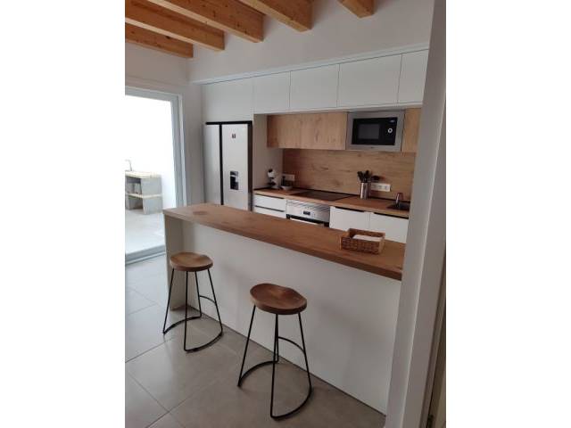 Ground floor of 50 m2: We have the main entrance to the living-dining room and from here you go to the beautiful fitted kitchen with an American breakfast bar, with access to the courtyard. It is equipped with an induction hob, electric oven, double fridge - combi, dishwasher and microwave as well as inventory and kitchen utensils and further back there is a small laundry area with washing machine. 1 guest toilet.
