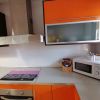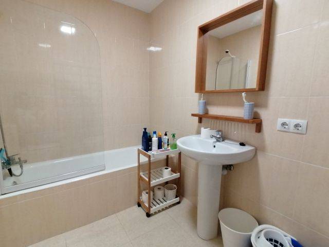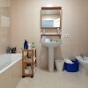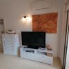 After a few steps we have access to the apartment. The entrance area consists of the living/dining room furnished with sofa, TV, chest of drawers, dining table and chairs with access to the front terrace. It connects to the modern fitted kitchen with microwave, refrigerator, dishwasher, washing machine, as well as electric oven and hob.