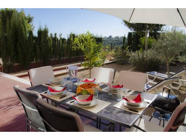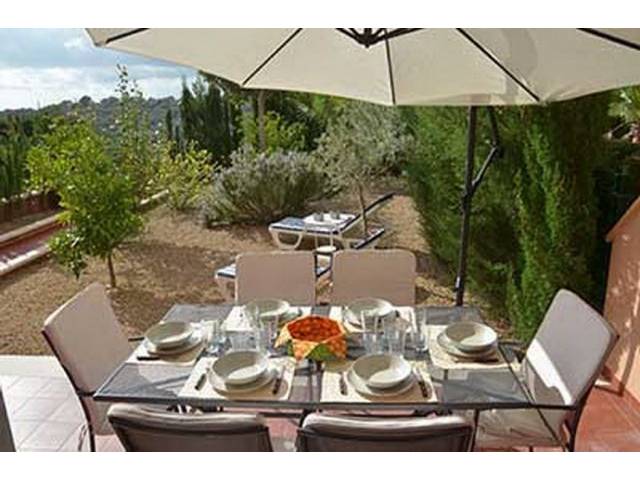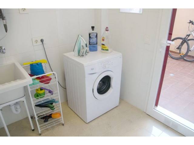 Rooms: The ground-floor apartment of approx. 80 m2 living area was built in 2009 and has a living/dining room with access to the terrace/garden, a separate modern fitted kitchen with electric oven, ceramic hob, refrigerator and microwave and a small utility room with washing machine with access to a small courtyard. The two bathrooms (one en-suite) have shower and bathtub. The two bedrooms are equipped with fitted wardrobes and AC (hot-cold).