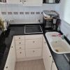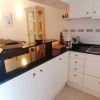 Entrance hall from which, at the front, is the living/dining room with a white kitchenette and black worktop. This is equipped with ceramic hob, oven, refrigerator and microwave.