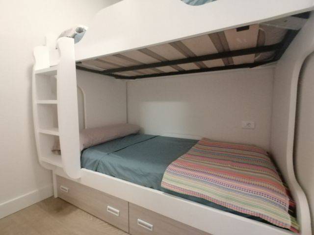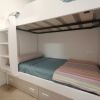 The entrance area consists of a bright hallway, to the left of which is 1 bedroom with a double bed, Smart TV, wardrobe and bedside table. On the left at the end of the hallway is the 2nd bedroom with a 2-tier bunk bed and wardrobe.