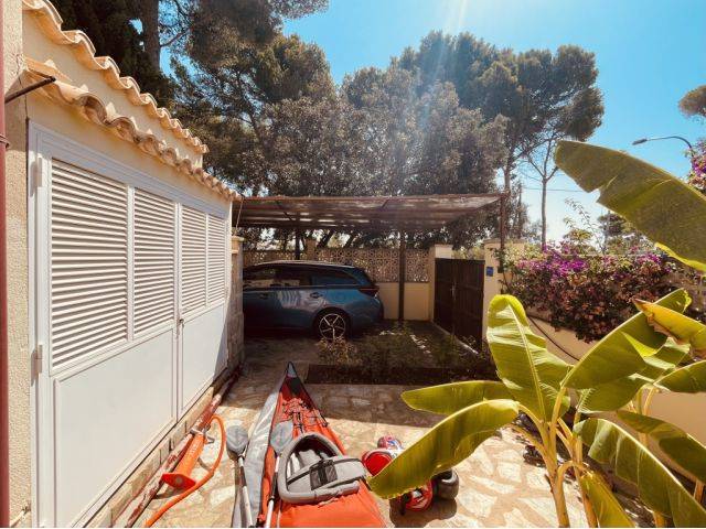 The walled plot measures about 260 m2 with a parking - pergola, cozy terrace corners and the rest is courtyard garden. A roof terrace offers a great view of the surroundings.