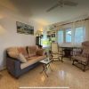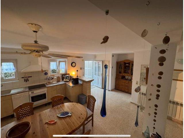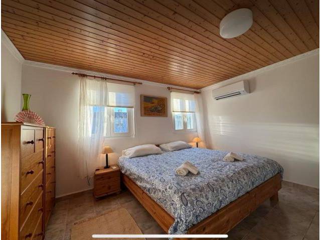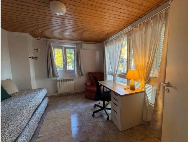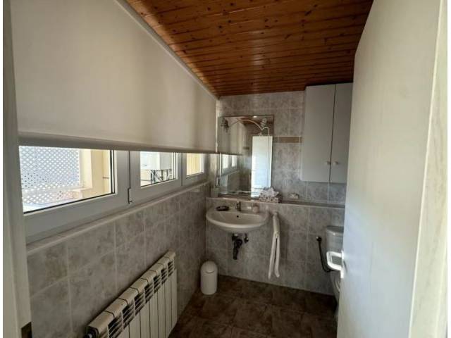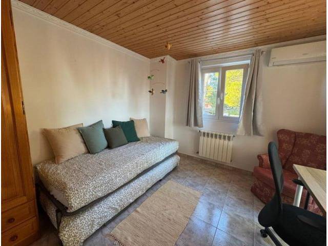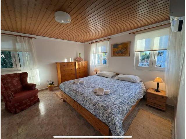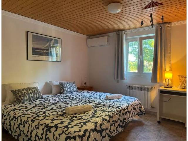 Upstairs are the 3 bedrooms: The master bedroom is spacious with a double bed, three windows and a large mirrored wardrobe. Another bedroom with two single beds and TVs and a third bedroom - with single bed to pull out as well as a small work table with office wheelchair and very wide windows overlooking the pine trees and the sea. Furthermore, 2 bathrooms with shower and a small laundry room with dryer and washing machine.