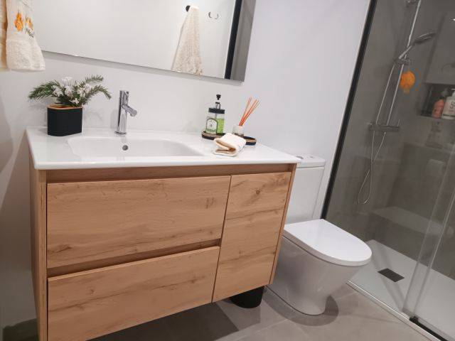 Ground floor of 50 m2: We have the main entrance to the living - dining room and from here we go to the beautiful fitted kitchen with an American counter . with access to the courtyard. This is equipped with induction plate, electric oven, double fridge - Combi, dishwasher and microwave as well as inventory and kitchen utensils and further back is a small laundry area with washing machine. 1 toilet.