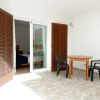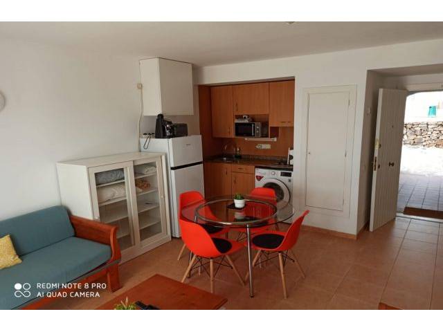 Entrance to the living/dining room with an open fitted kitchen, which is equipped with a 2-burner ceramic hob, refrigerator, microwave, electric water heater and washing machine.