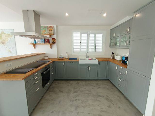 Facilities: Double glazing, white aluminium blinds, white painted interior doors, microcement floors on the ground floor and rustic tiles on the upper floor, TV with Spanish channels and internet connection via fiber optic at 300 Mb, central AC (hot - cold) in all rooms and additionally 5 extra electric heaters, GESA electricity, municipal water, hot water via solar collectors. Completely modern and like-new and furnished in discreet colours including bed linen and towels.