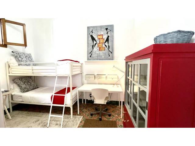 Large room with large window front and sliding door system, where it leads to the courtyard, to the right of it there is 1 double bedroom, 1 further double bedroom with built-in wardrobe, 1 double bedroom with double bed and 1 bathroom ensuite with shower.