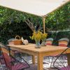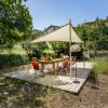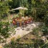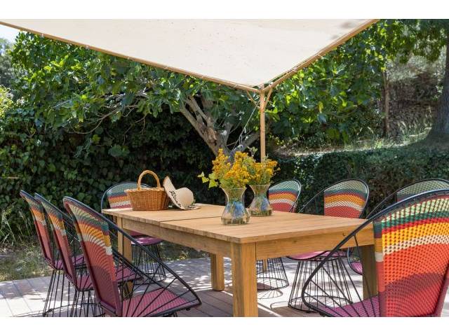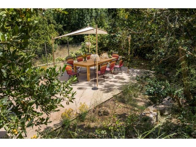 The walled and fenced rustic and natural garden with a manual wooden gate measures approx. 600 m2 y has a terrace area with awning, chairs and table, sun loungers and a small PC pool. Parking outside on the street.
