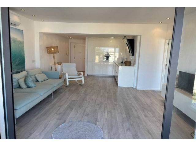 Equipment: Double glazing, intercom, 1 x AC / hot-cold, 100 Mb internet line, municipal water, GesaStrom, ceiling dimmer lights, Smart TV, sliding door to the terrace, electric hot water heater of 100 l, light grey laminate floors. Completely like-new furnished including towels and bed linen. Washing machine in laundry room next to the kitchen.