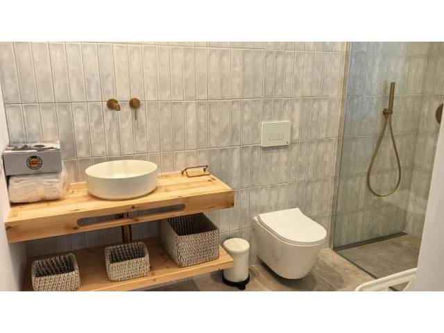 Equipment: vinyl tiles in imitation wood look, double glazing, blue wooden blinds, German channels via Smart TV – HDMI, Spanish TV antenna and internet connection 600 MB., central AC, towel rail in the bathrooms, GESA electricity, city water, hot water via electric boiler. As good as new, furnished and equipped 100% in a rustic, up-to-date style as well as with all its inventory, bed linen and towels. Intermediate cleaning on request extra.