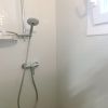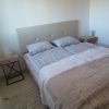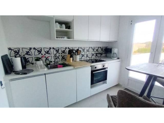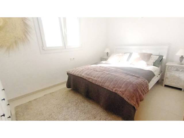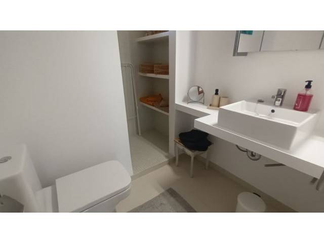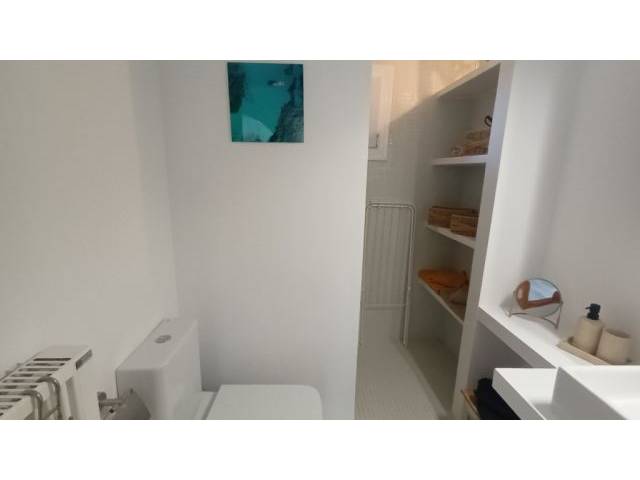 To the left - 1 bathroom with shower, 1 guest toilet and the nice white fitted kitchen with a small breakfast area and terrace access and the master bedroom with double bed.