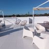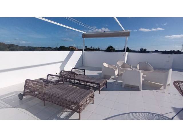 Outdoor area: 1 uncovered terrace from the kitchen with steps to the garden, 1 further covered terrace with partial sea view from the living-dining room and a dreamlike large roof terrace with full comfort for seating and lounging (with partial sun protection). Access from the outside stairs. Shared laundry room with washing machine and dryer on the ground floor - behind the house. The outdoor hot-water shower and the pool of 2.50 m x 7 m can be used.
