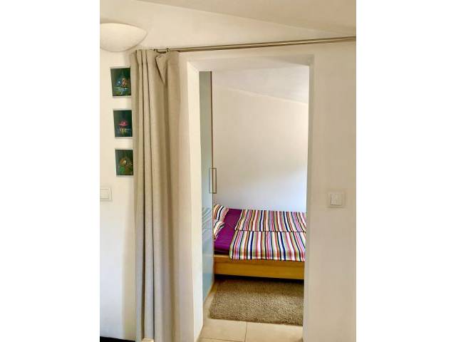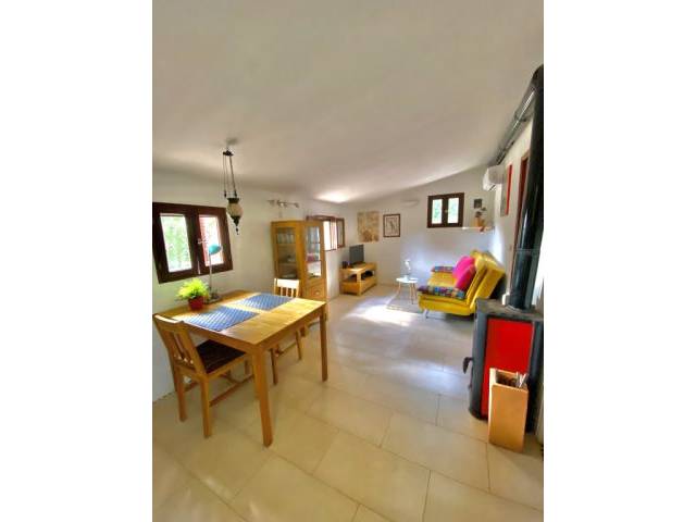 40 m2, 1 small bedroom (140 cm bed placed against the wall), 1 separate kitchen. 1 bathroom with shower, 1 living-dining room with a fold-out sofa, wood-burning stove, air conditioning, infrared heating in the bedroom, good Wi-Fi, satellite TV, gas grill,