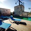 Una escalera tiene una puerta de salida a la piscina y más arriba en la escalera hay un desván acristalado con vistas al salón.
