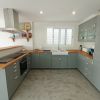 Planta baja: Zona de entrada con una escalera que conduce arriba, 1 aseo de cortesía y acceso al garaje. El salón-comedor cuenta con una cocina abierta y gris empotrada con península y, por supuesto, con todos los electrodomésticos y utensilios importantes. Desde aquí se accede a la terraza y a la zona de la piscina.