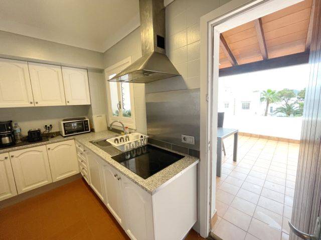 La cocina, que tiene salida a la gran terraza, tiene una mesa de desayuno y está equipada con placas de inducción, horno eléctrico, nevera. 1 cómodo y amplio cuarto de baño con ducha.