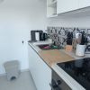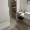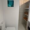 A la izquierda - 1 baño con ducha, 1 aseo de cortesía y la bonita cocina blanca equipada con una pequeña zona de desayuno y acceso a la terraza y el dormitorio principal con cama doble.