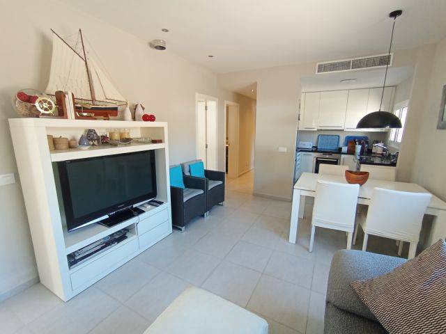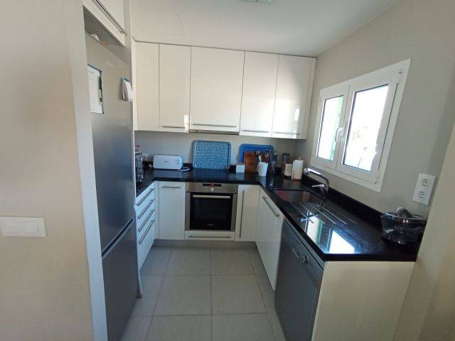 Tenemos la entrada al salón-comedor con cocina americana amueblada y equipada con todos los electrodomésticos como vitrocerámica, horno eléctrico, nevera y lavavajillas.