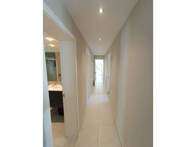 Un pasillo conduce a los 2 dormitorios con camas dobles, 1 baño con ducha y 1 dormitorio adicional con 2 camas individuales.