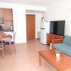 Entrada al salón-comedor con cocina abierta amueblada, que está equipada con 2 vitrocerámicas, nevera, microondas, calentador de agua eléctrico y lavadora.
