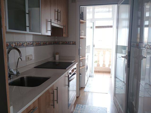 El 2.º dormitorio tiene 2 camas individuales, armario empotrado y ventana al balcón. Además una cocina práctica y en tonos marrones, que está conectada a un pequeño balcón de servicio con lavadora y equipada con