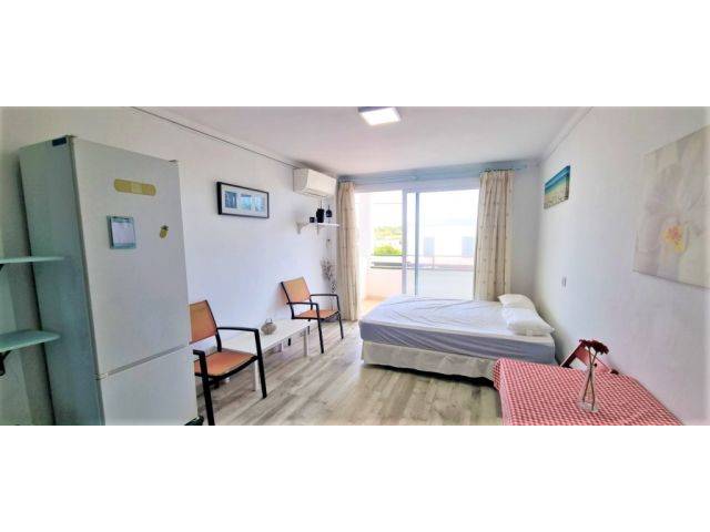 La vivienda cuenta con una luminosa habitación, cocina equipada, baño completo, armarios empotrados, aire acondicionado y una agradable terraza donde disfrutar del clima mediterráneo.