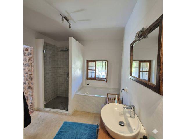 En la zona exterior, junto a la piscina, la propiedad ofrece un baño independiente y un apartamento de invitados con cocina propia, ideal como dormitorio adicional, estudio de trabajo o alojamiento independiente.