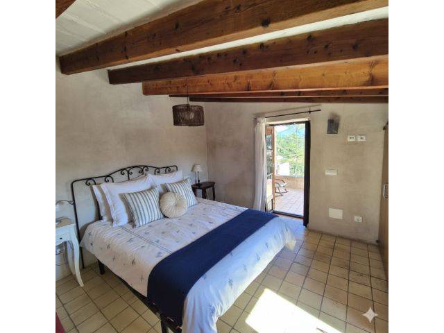 Al acceder a la vivienda encontramos un acogedor salón-comedor con vigas vistas que mantiene la esencia tradicional de la arquitectura mallorquina. La cocina abierta conecta con el jardín, aportando luz y amplitud al espacio. En esta misma planta dispone de un baño de invitados que también puede funcionar como baño en suite y, a su izquierda, una preciosa suite con mucho encanto.