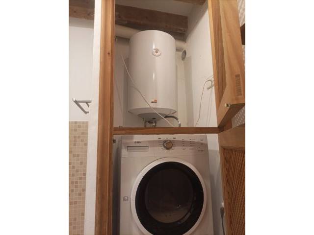 Al otro lado del pasillo, el amplio baño cuenta con una bañera grande y ducha. Además, la lavadora y la secadora independiente están convenientemente escondidas en un armario discreto, manteniendo el espacio ordenado y facilitando el lavado.