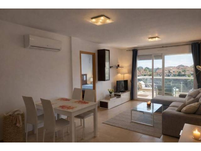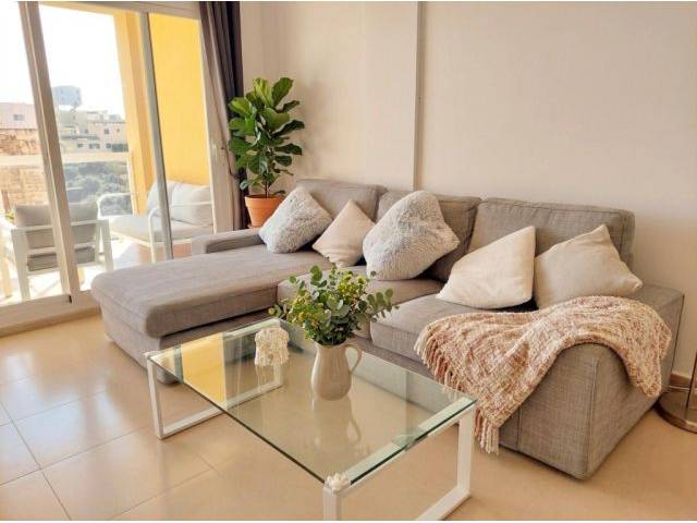 La zona de estar es luminosa, moderna y abierta. Desde allí se accede a un balcón con vistas a la piscina comunitaria y a la bahía de Cala Antena.